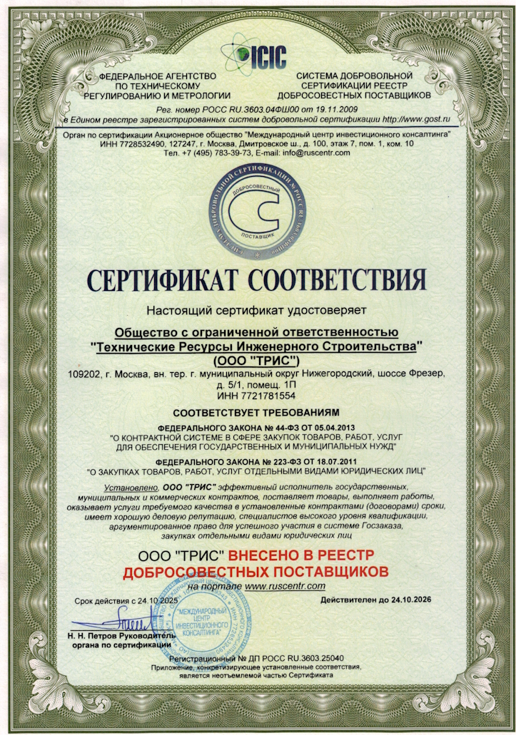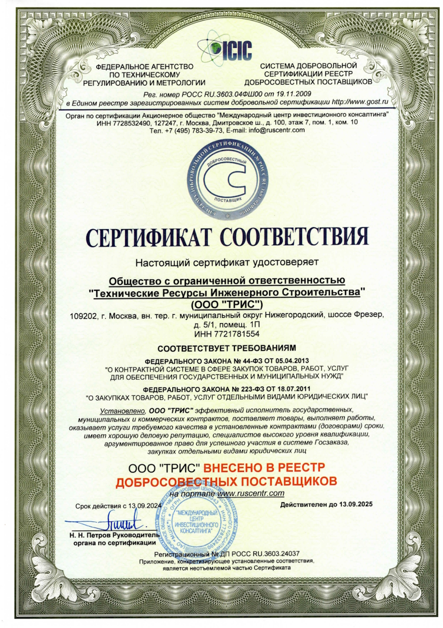 Компания «ТРИС» в 2016г. получила сертификат соответствия требованиям национального стандарта поставки в Системе сертификации поставщиков услуг «Реестр добросовестных поставщиков». Данный документ выдан АО «Международный центр инвестиционного консалтинга» по результатам выборочной оценки эффективности деятельности российских организаций.